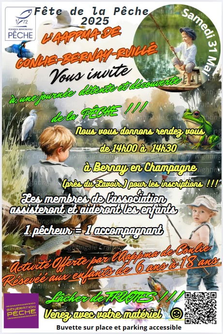 A l'occasion de la fête de la pêche ,le samedi 1 juin 2024 ,nous avons organisé un lâcher de truite pour les enfants sur la commune de Bernay en Champagne. Tout c'est bien déroulé pour le plaisir des plus jeunes. La fête de la pêche a pour but la découverte de notre passion.